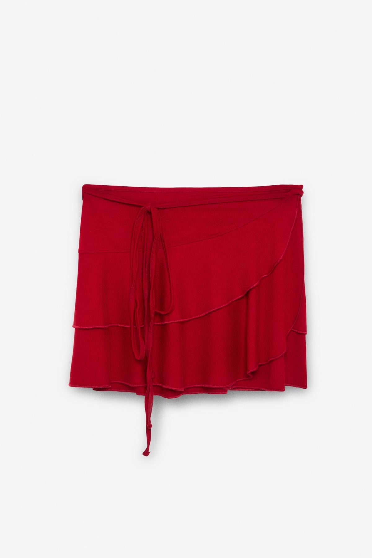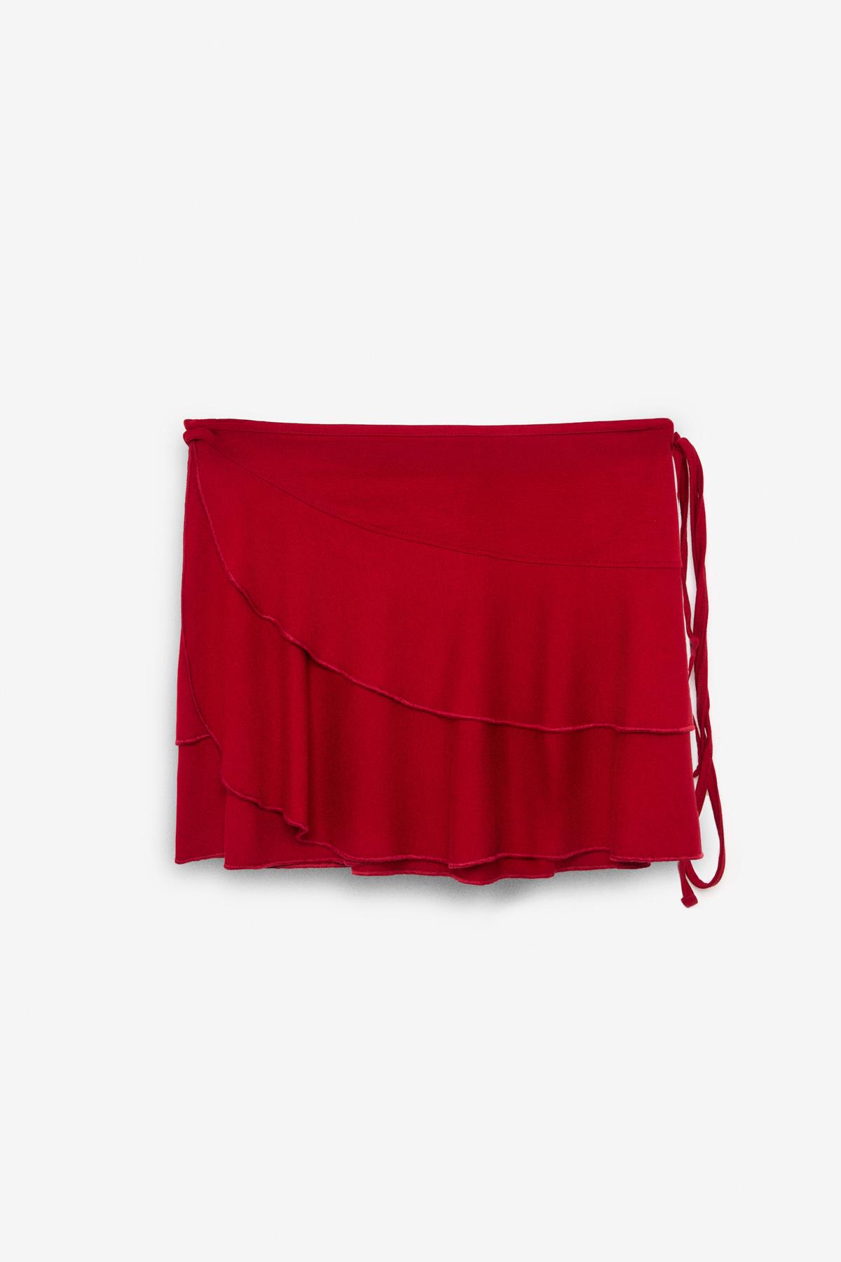 SARELIN Kadın Volanlı Anvelop Yandan Bağlamalı Mini Kırmızı Etek